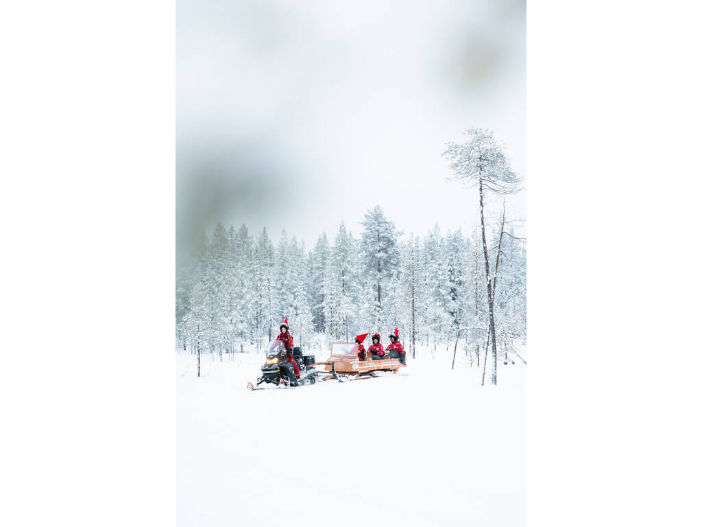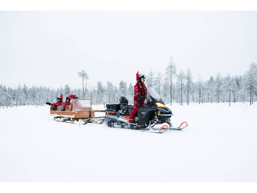 Sit back, relax, and enjoy the magic of Lapland on a snowmobile sleigh ride through breathtaking winter scenery — guided by one of Santa’s elves.