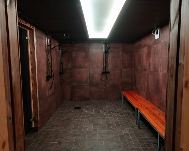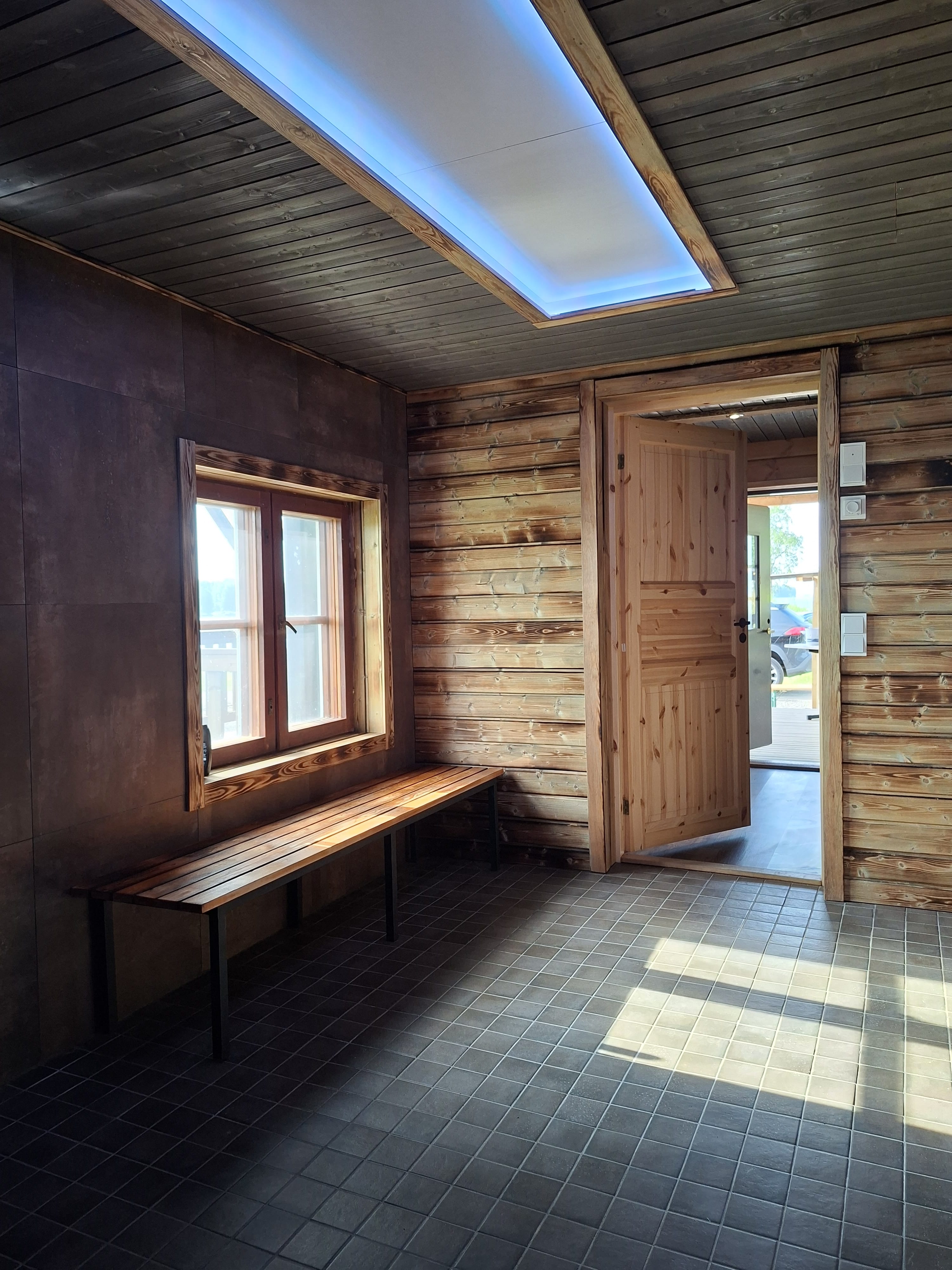 Oleskelualue, jossa pieni jääkaappi, pukuhuone, wc. Suihku kolmelle henkilölle.